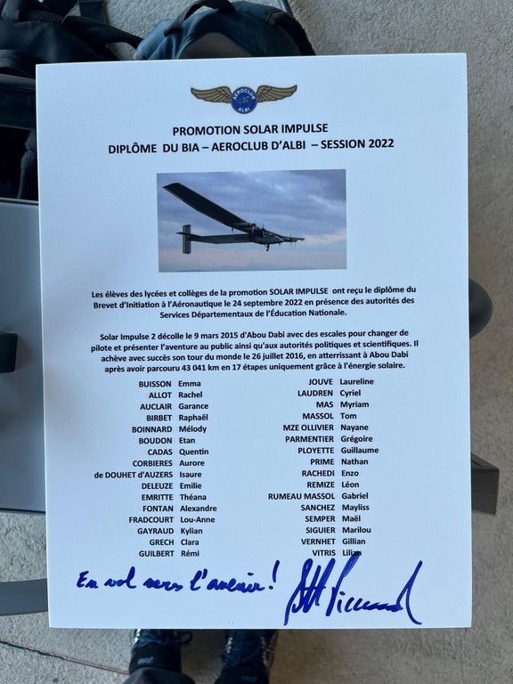 La promotion SolarImpulse de juin 2022 a été honorée par Bertrand Picard, lors du départ du rallye aérien TOULOUSE-ST LOUIS du Sénégal. Le Velis avion éléctrique du Club a réalisé un vol avec le Bréguet XIV de l'aéropostale et Bertrand PICARD informé du nom de Baptême de la promotion 2022 SolarImpulse a signé la plaque de l' aéroclub d'Albi. Merci à lui de ce geste sympathique.